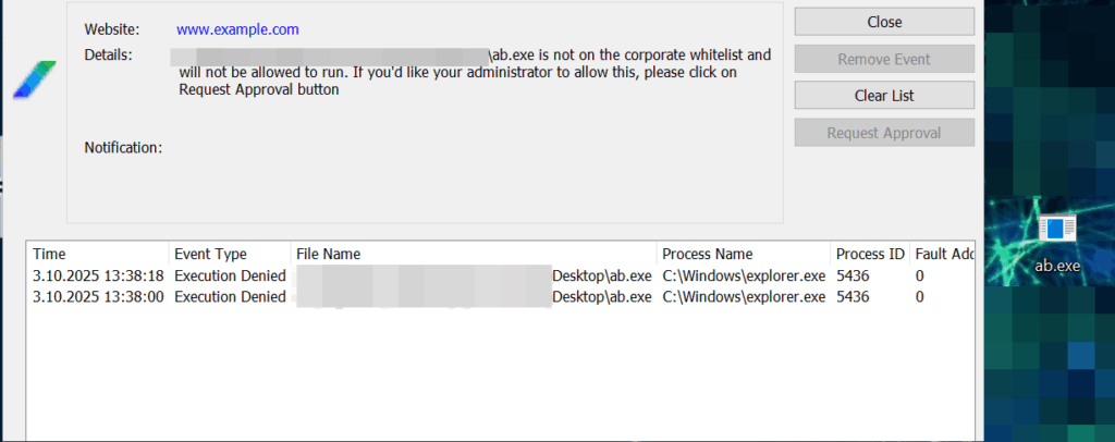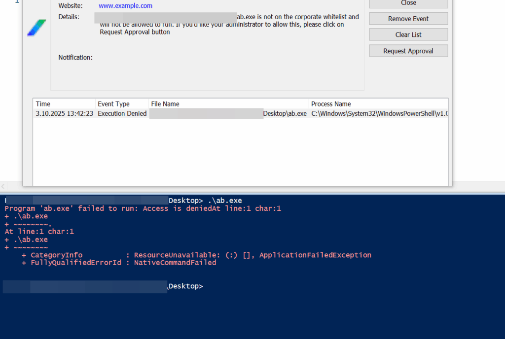 Calling the executable this way shows the program running successfully. If you save the PowerShell script with a .ps1 extension and run it, it will be launched from disk — and because it won’t be on the whitelist, SolidCore will block it. Therefore, you should paste the script directly into a PowerShell session and run it without saving it to disk.